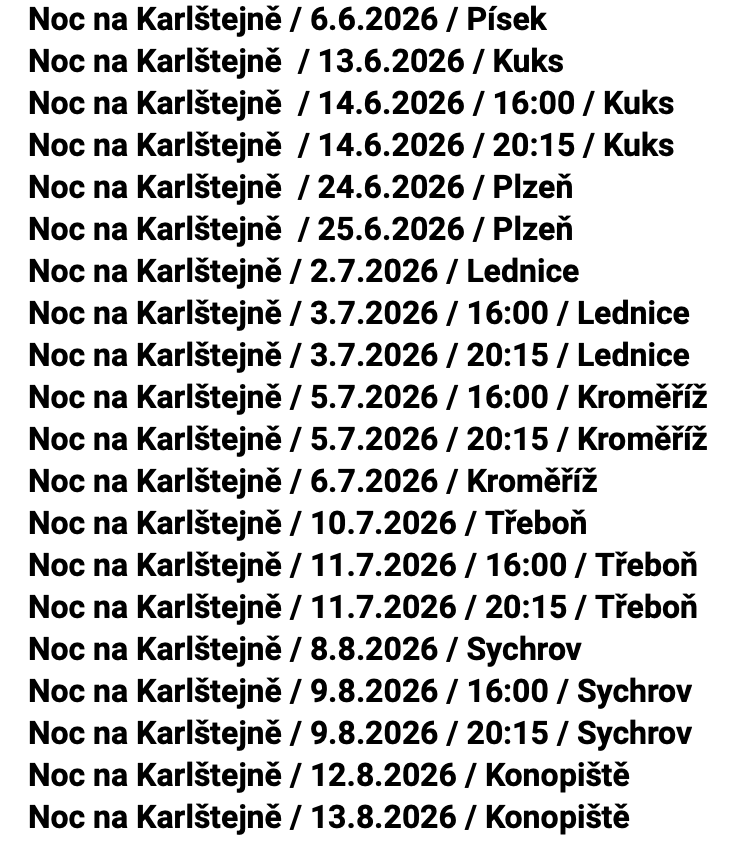 Představte si letní večer pod širým nebem, kdy se na nádvoří historických zámků rozezní tóny nesmrtelných melodií Karla Svobody. Muzikál "Noc na Karlštejně" vás zve na cestu časem do období vlády císaře Karla IV., kde se láska a odvaha snoubí s tajemstvím a intrikami.